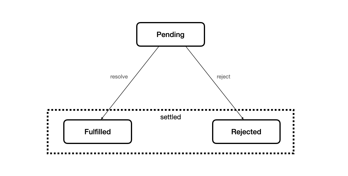 비동기 처리가 아직 수행되지 않은 상태를 pending(대기)이라 하고, 비동기 처리가 성공할 경우 resolve 함수를 호출하고 프로미스를 fulfilled(이행) 상태로 변경한다. 만약 비동기 처리가 실패하거나 오류가 발생하면 reject 함수를 호출하고 프로미스를 rejected(실패) 상태로 변경한다. 이렇게 fulfilled나 rejected 둘 중 하나로 비동기 처리가 수행된 상태를 settled라 하고, 일단 settled가 되면 다른 상태로 변화할 수는 없다.